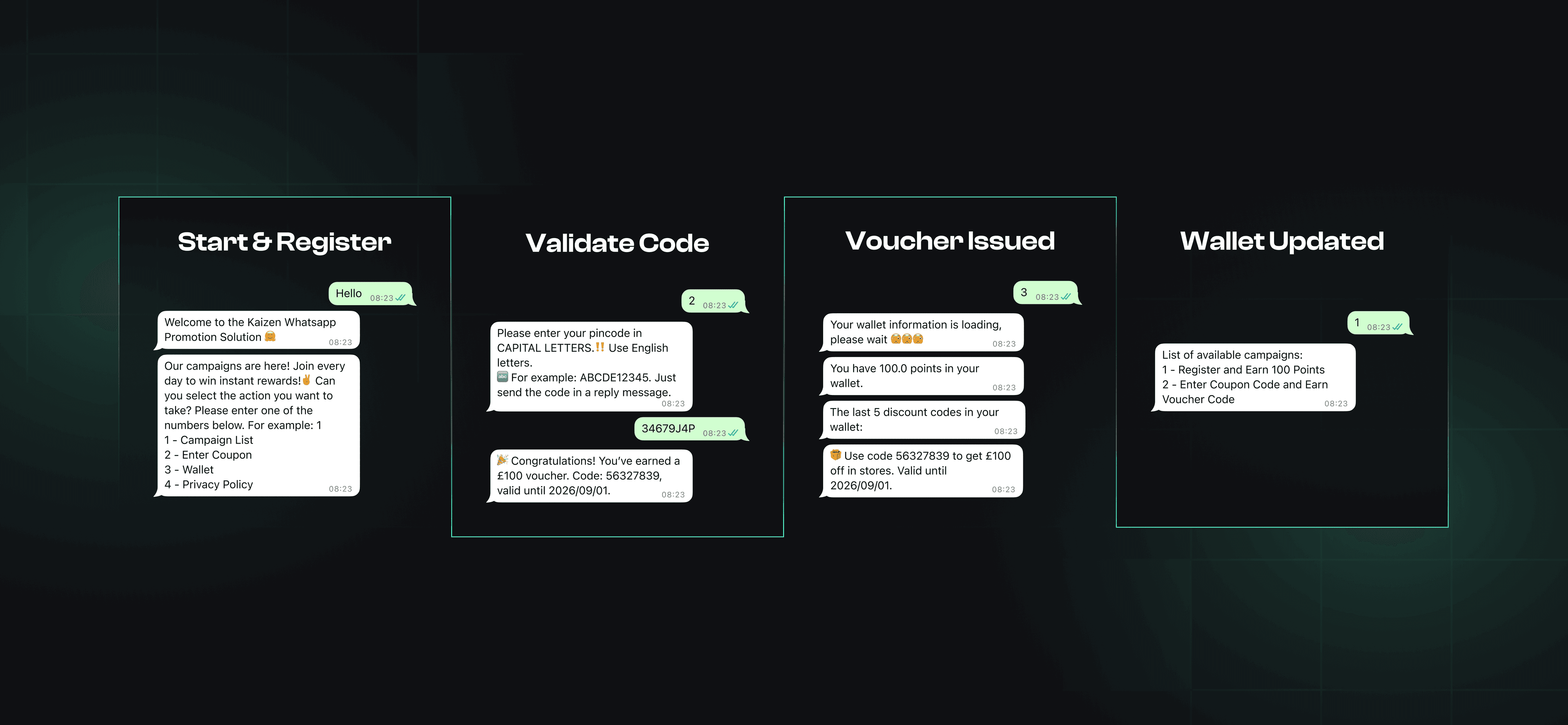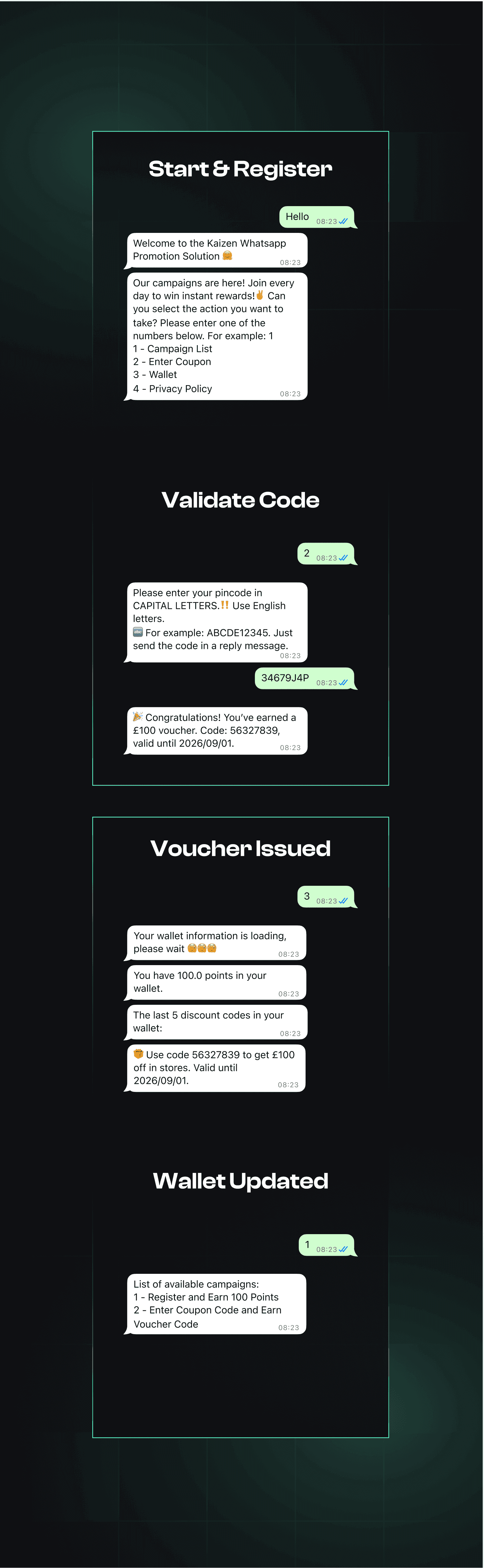 From the first message to instant rewards, every step of the loyalty experience happens seamlessly within WhatsApp. No external app, no redirects, just real-time engagement.